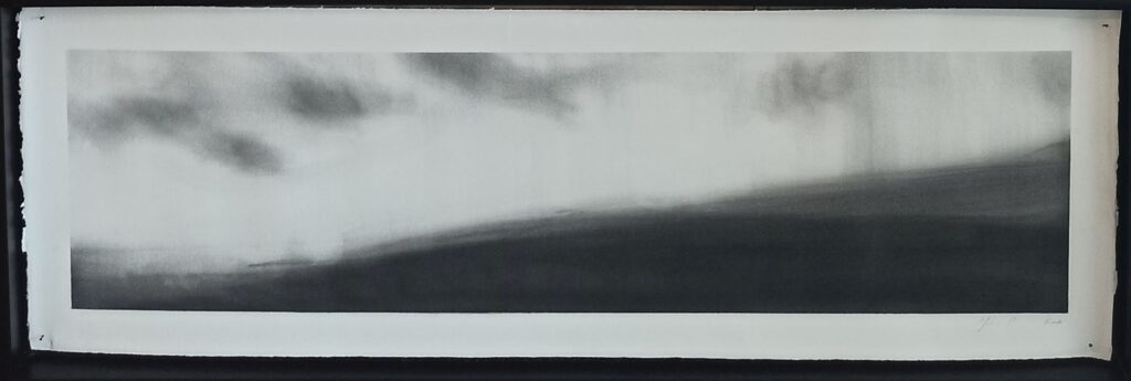 Grafiet en papier, meer heeft deze kunstenaar niet nodig om de kijker mee te nemen in een wereld waar de tijd stil staat. De serie grote grafiettekeningen van Posthumus (1989) is geïnspireerd door wolkenpartijen boven kustlandschappen. Dat past natuurlijk geweldig bij de locatie van het Douanehuisje.